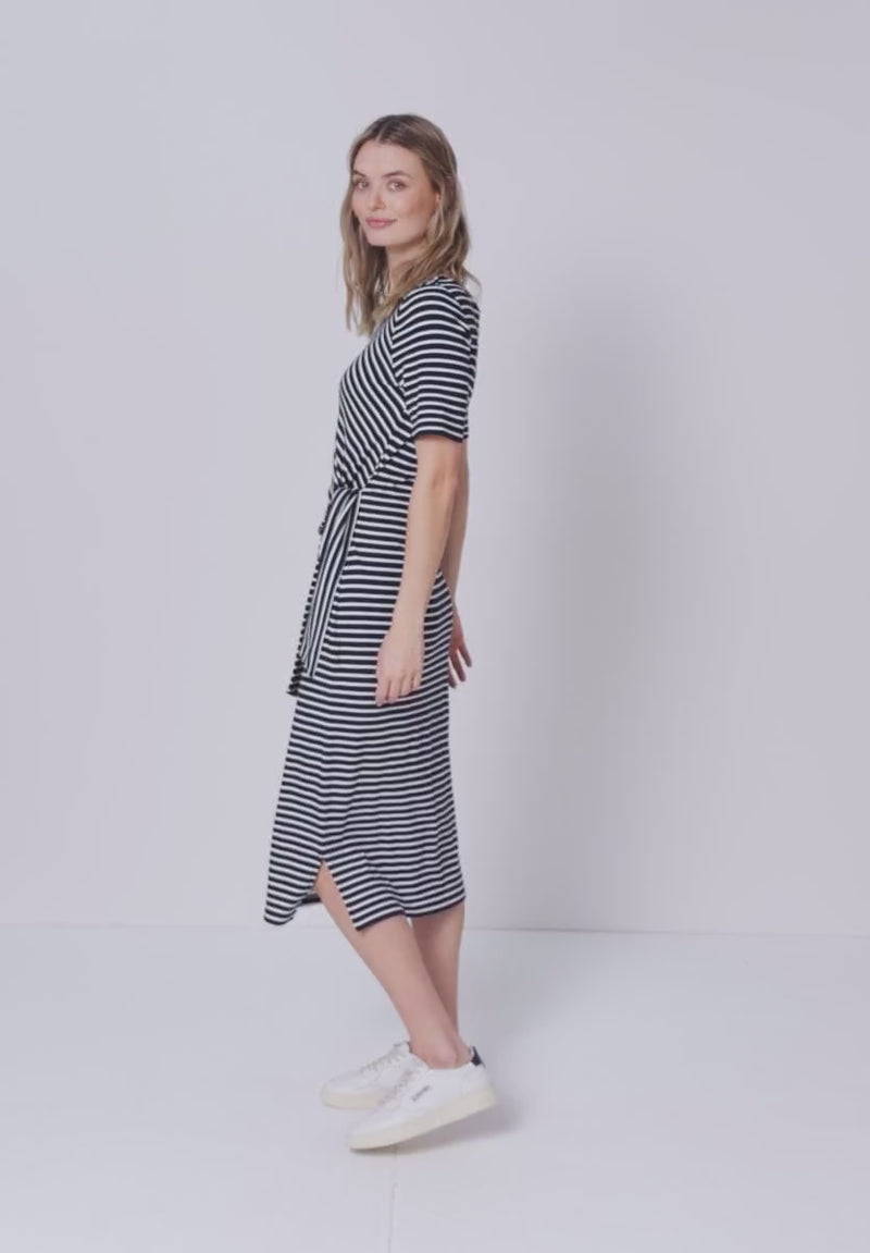 This striped jersey dress from Street One for women offers a comfortable feel and a flowing look thanks to its soft viscose blend with added stretch. The side knot detail creates a feminine silhouette and adds a charming touch. The round neck, short sleeves, and side slits emphasize the relaxed, casual style. An ideal midi dress for modern looks