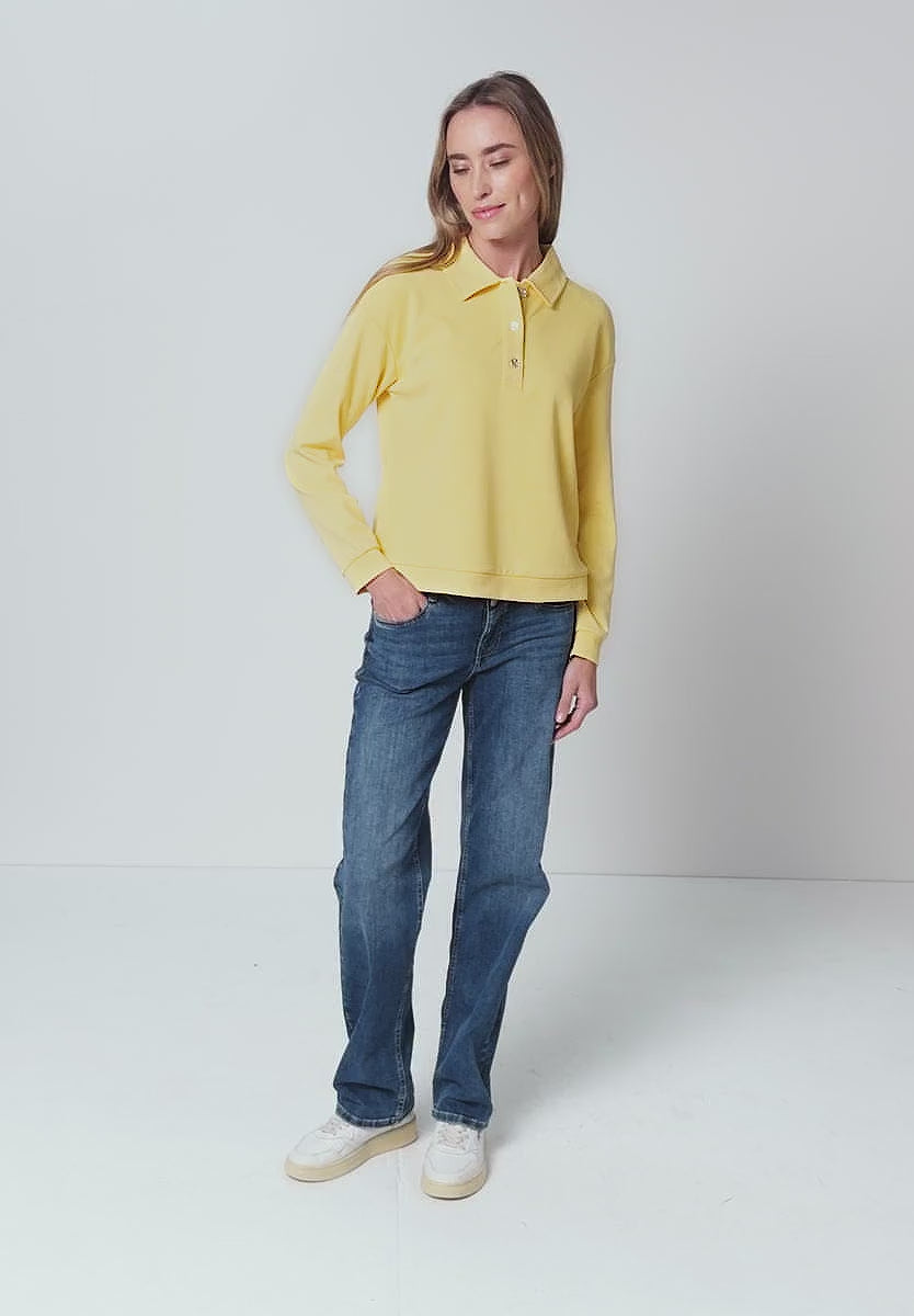 This polo shirt from Street One, featuring a button detail at the neckline and a sporty polo collar, boasts a striking melange look. The stretchy fabric blend ensures comfort, while the long sleeves make it ideal for transitional weather. Casual, modern, and comfortable – perfect for active days.